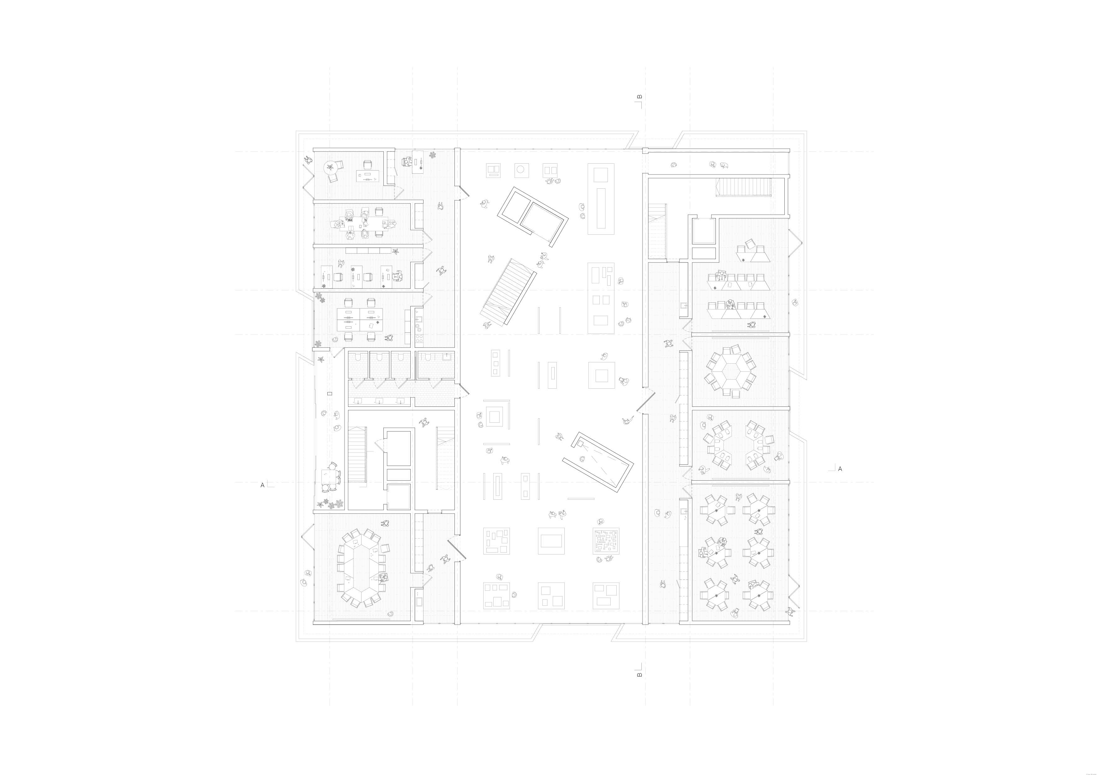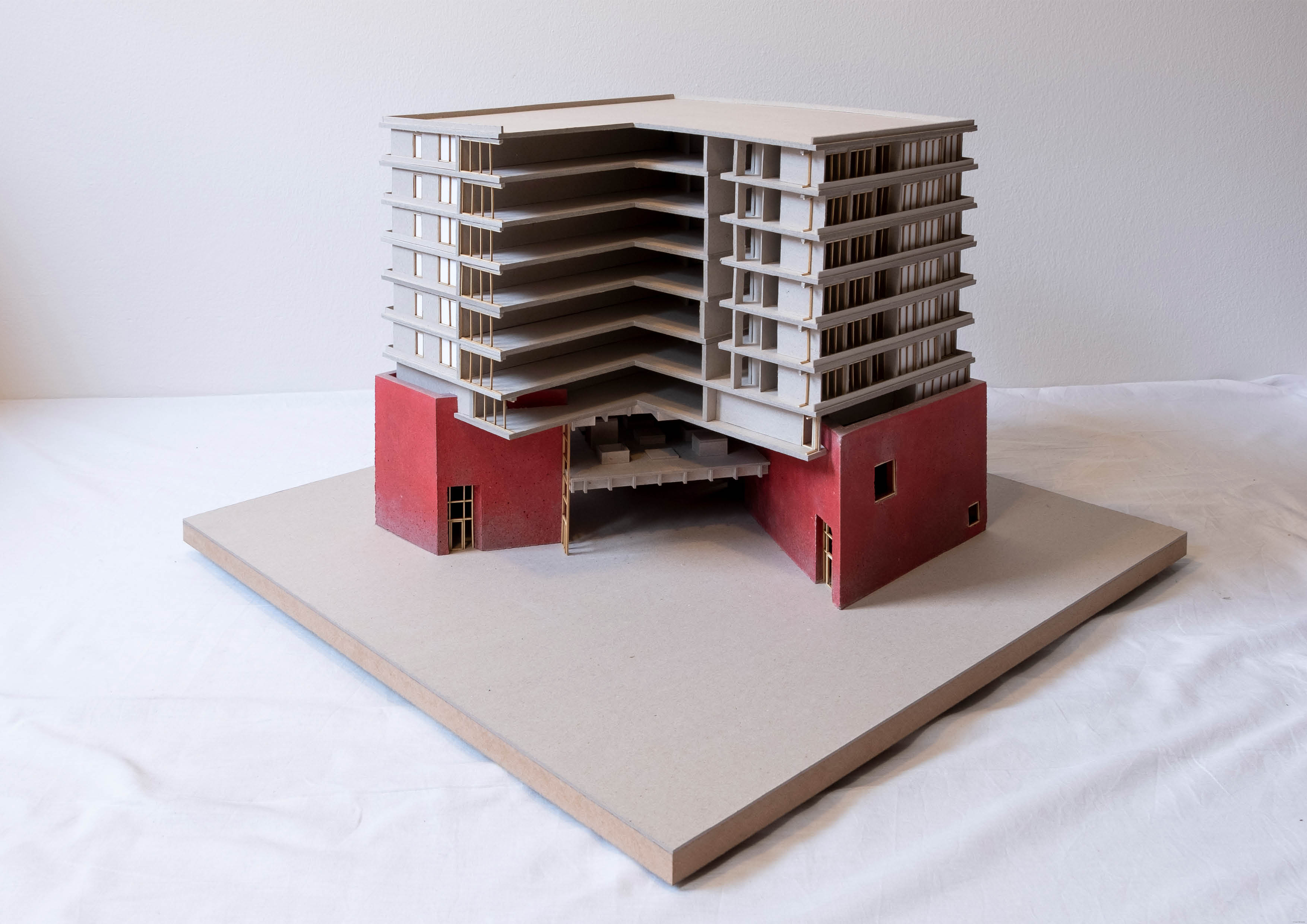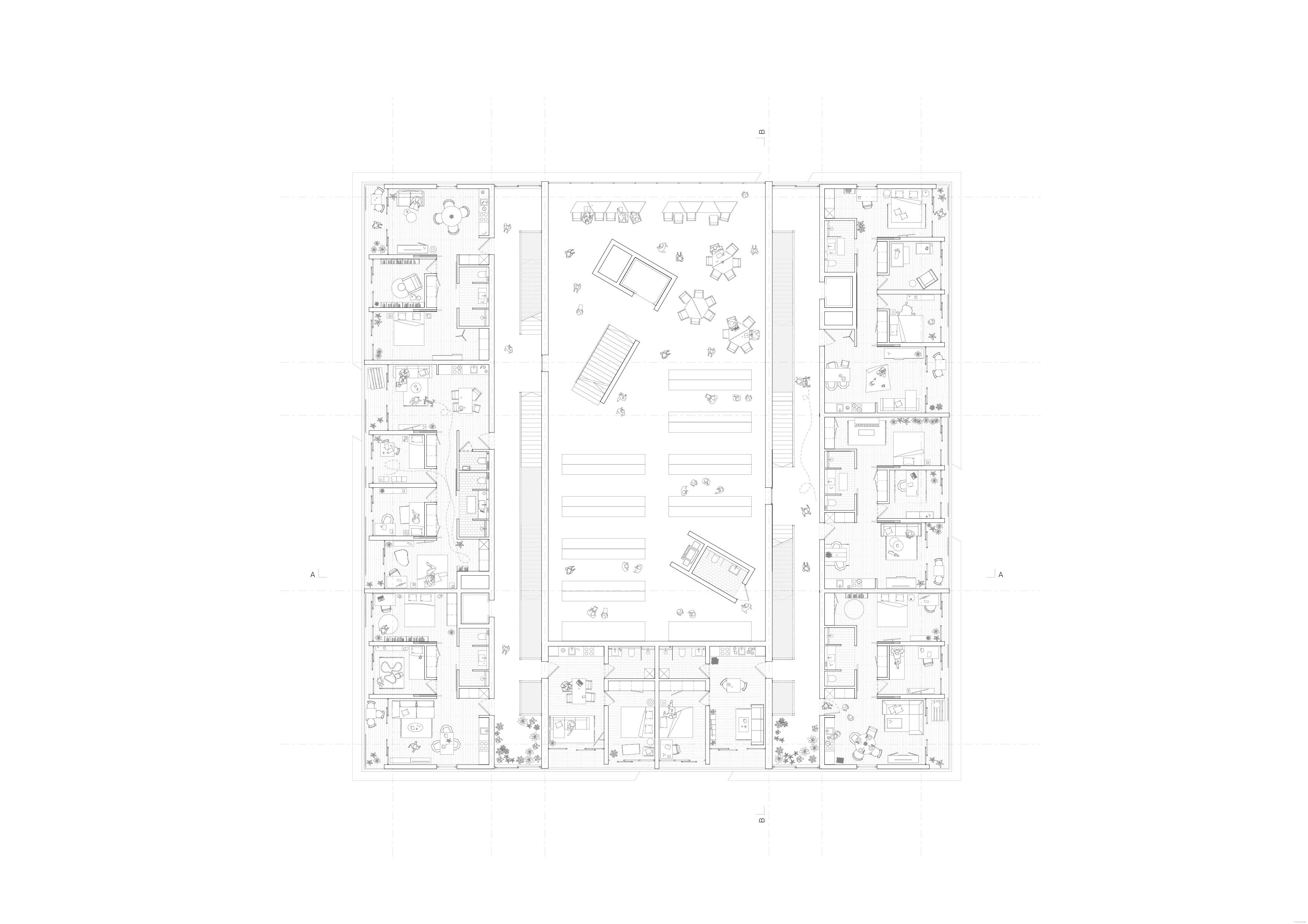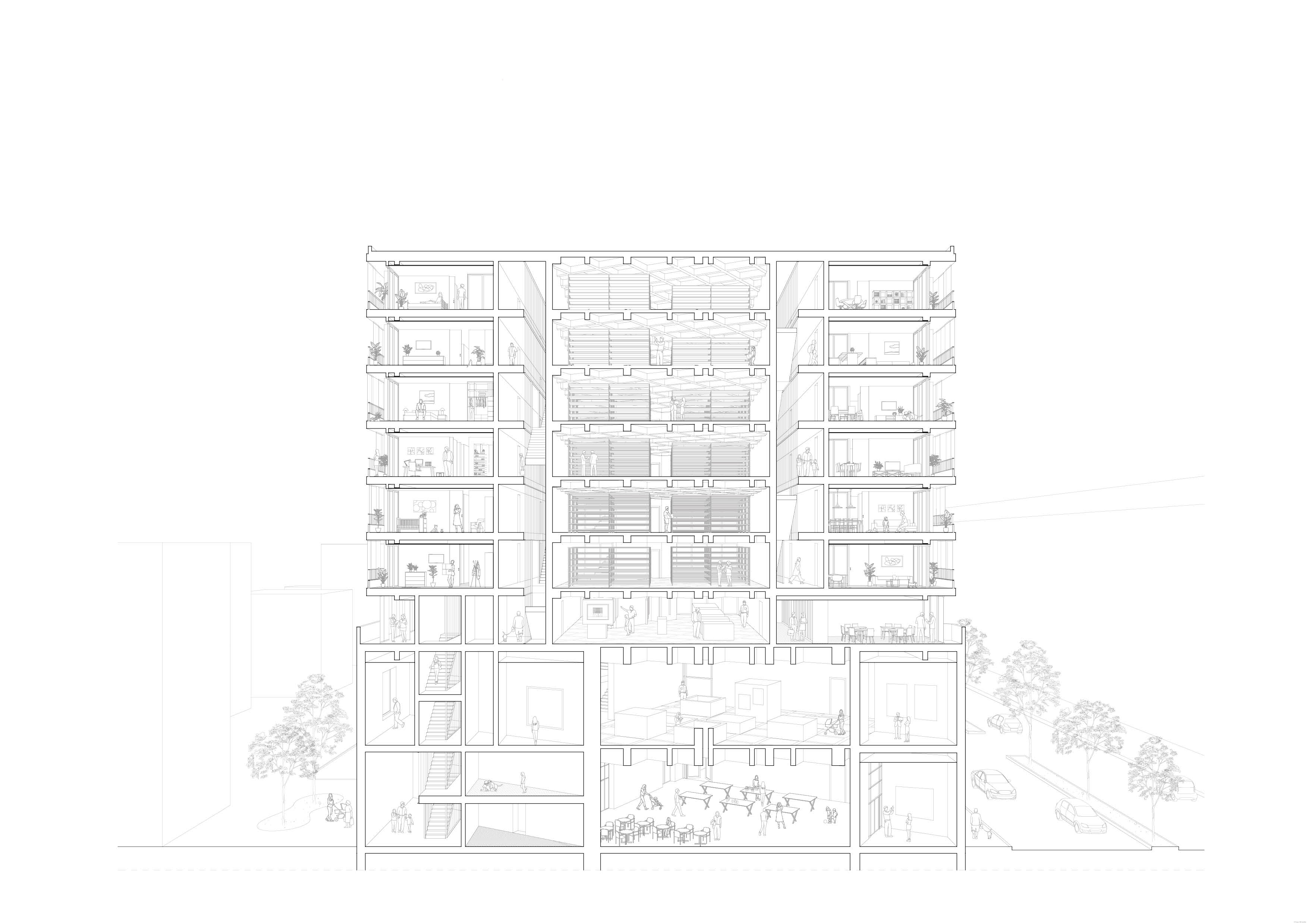 Den jeweiligen Funktionen angepasst, gibt es unterschiedliche Tragwerkssysteme. Die öffentlich zugänglichen Flächen sind von einer Kassettendecke geprägt, während die Wohnungen in einer Klassischen Schottenbauweise funktionieren. Ebenso wie mit den Funktionen, vereint der massive Sockel beide Systeme miteinander.