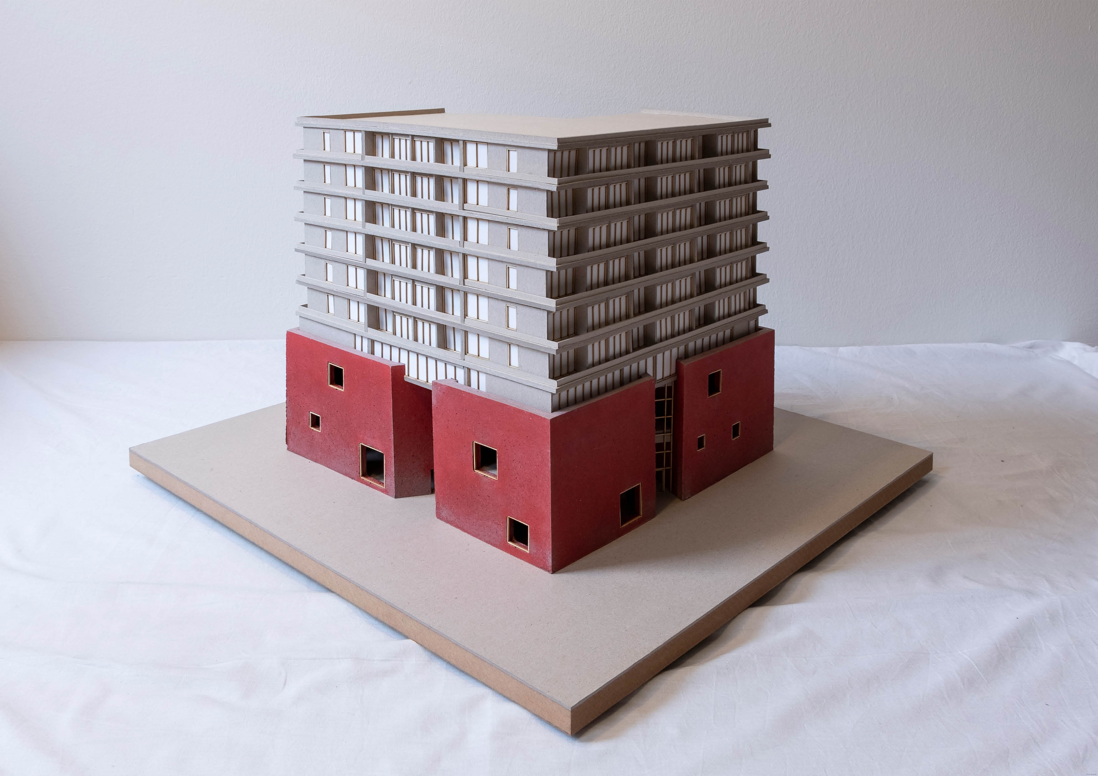 In diese massiven Sockelzone, die ein Museum umfasst, wird der Hybrid aus Archiv und Wohnen gesteckt.